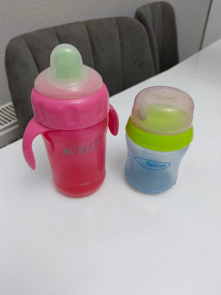 Kulp ve açılır kapaklı, pembe renkli bebek suluğu. Yanında yeşil kapaklı küçük suluk bulunmaktadır.