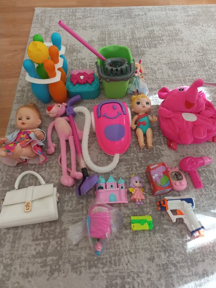 Pembe ve yeşil renklerde bebekler, oyuncak elektrikli süpürge, mop, peluş fil ve çeşitli küçük aksesuarlar içeren renkli oyuncak seti.