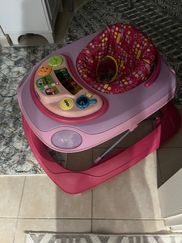 Renkli pembe bebek yürüteci, etkileşimli oyun paneli ve rahat yastıklı oturma alanıyla bebeklerin yürümesini destekler.