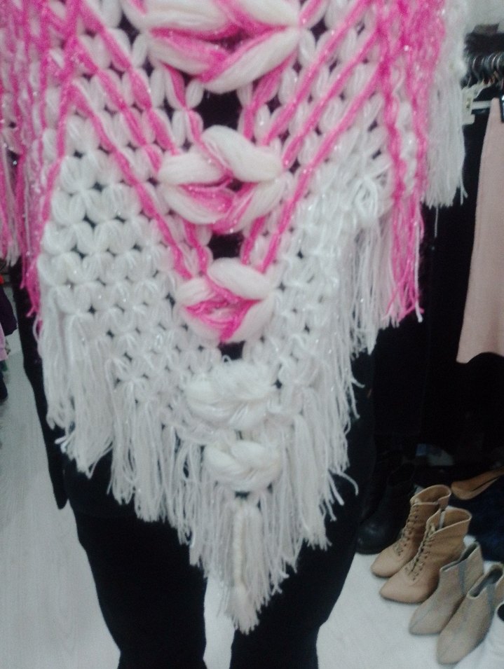 Renkli pembe ve beyaz tonlarda örgü bohem kız çocuk şalı, yumuşak dokusu ve püsküllü kenarlarıyla retro, hippie tarz sunar.