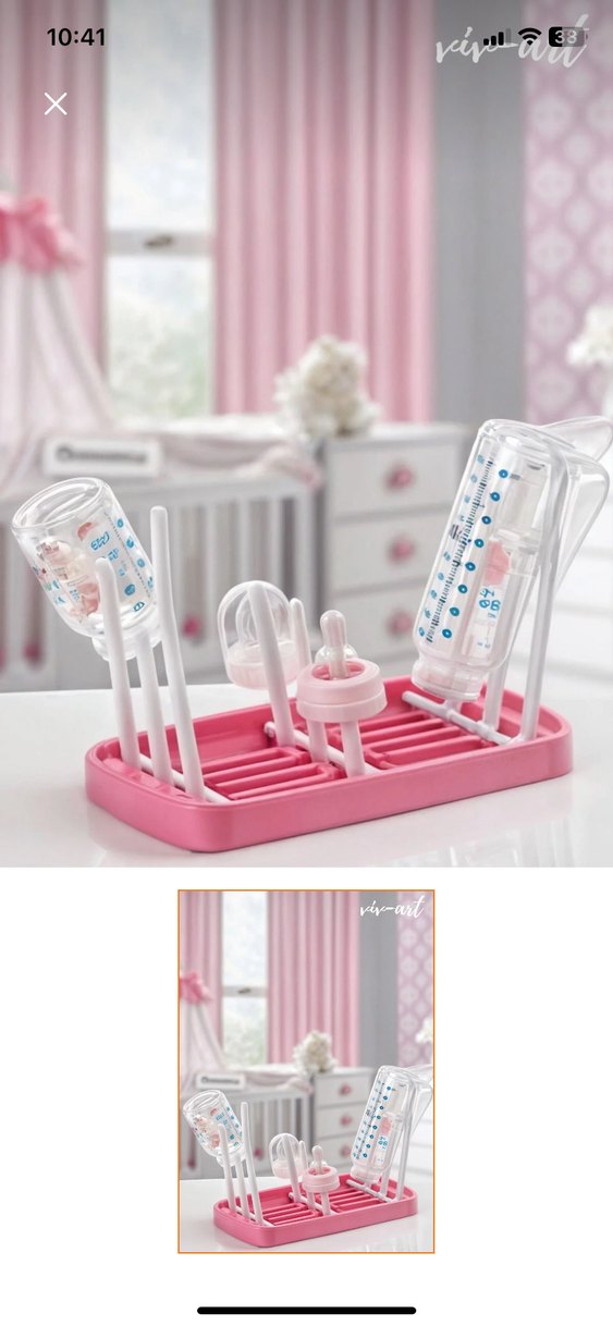 Bebek biberonları ve aksesuarlarını düzenli ve kuru tutan renkli pembe kurutma standı.