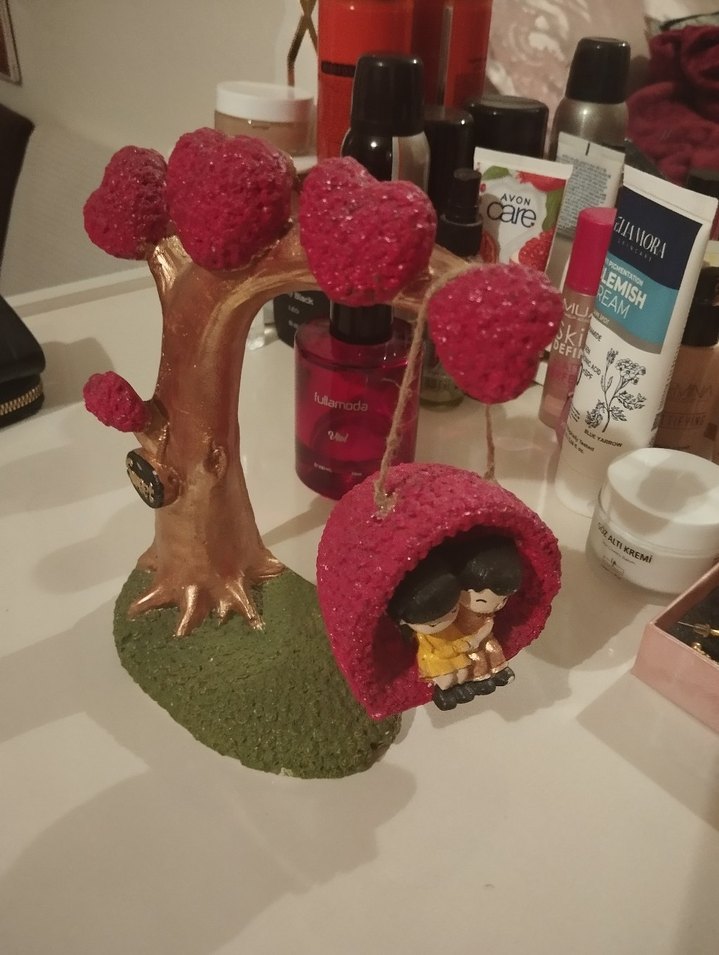 Kalp şeklinde meyveleri olan ağaç ve iki küçük figürün bulunduğu pembe renkli salıncak biblosu.
