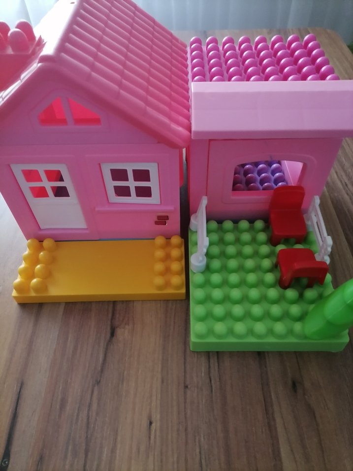 Renkli bloklardan oluşan pembe oyuncak ev, küçük bahçesi ve kırmızı sandalyeleriyle hayal gücünü destekler.