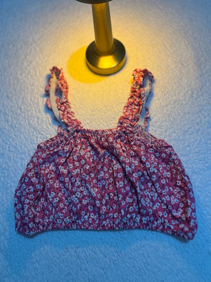 Renkli pembe, çiçek desenli kısa mini crop. askıları ile rahat kullanım sağlar.