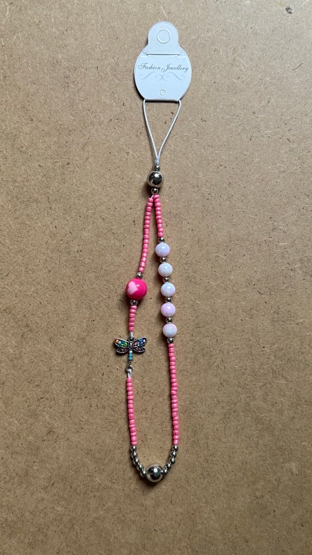 Renkli pembe boncuklardan oluşan, ejderha böceği figürlü bohem tarz kolye. Günlük kullanım için uygundur.