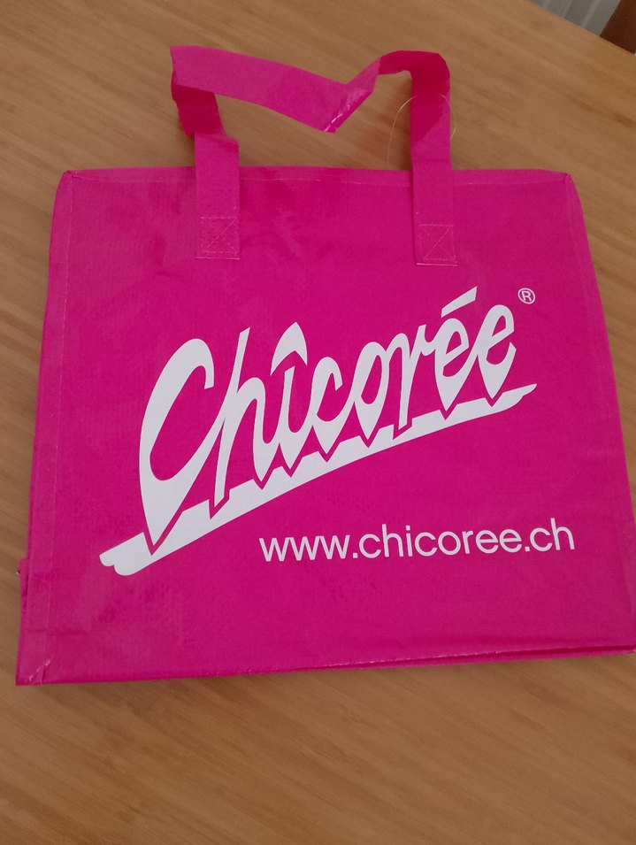 Renkli pembe renkli, Chicorée logosu ve web sitesi baskılı fermuarlı çanta. Sentetik kumaştan yapılmış, sağlam saplı, günlük şık kullanıma uygun.boy29/ eni 32 cm çok amaçlı içi geniş.