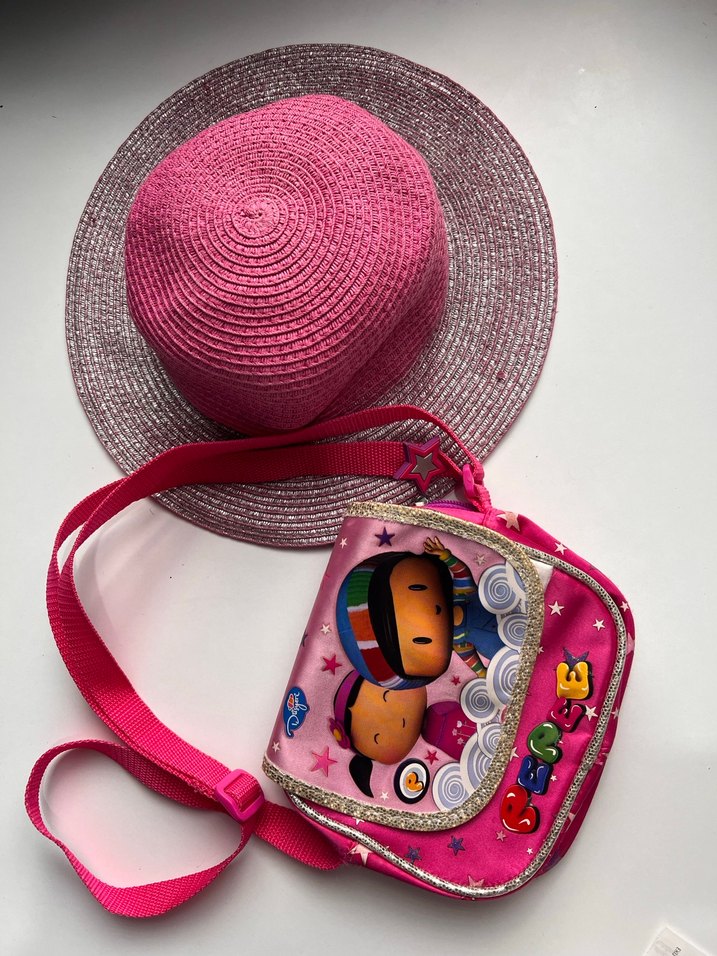 Pembe renkli çocuk çantası, Pepeeli çanta ve şapka. Şapka 8 yaşa kadar falan olur