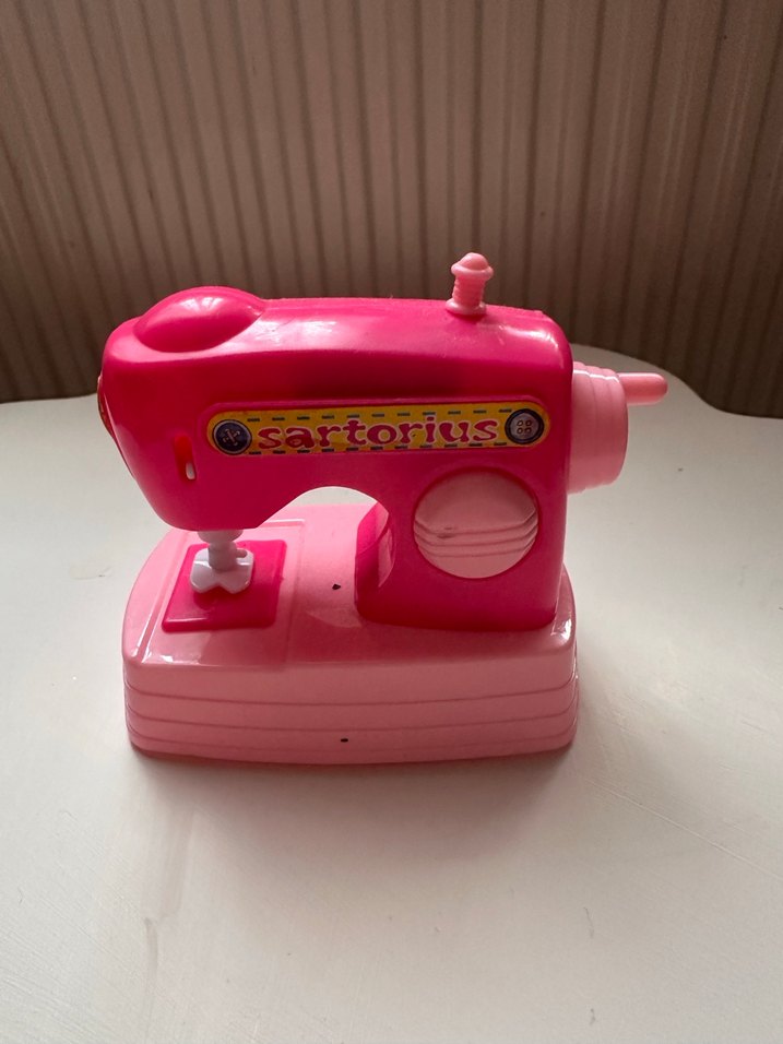Çocuklar için tasarlanmış, "sartoriuso" yazılı renkli pembe oyuncak dikiş makinesi. 2 kalem pille çalışmaktadır.