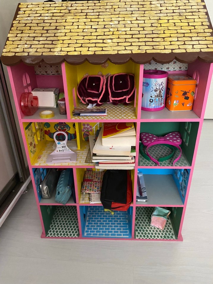 Çatı şeklinde tasarıma sahip, rengarenk pembe çocuk rafı. Oyuncak ve kitaplar için düzenli depolama alanı sunar.