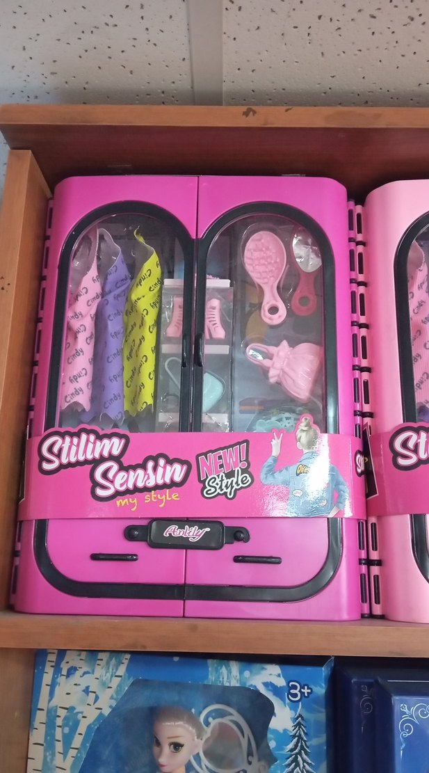 Renkli pembe çocuk gardırop seti, içinde çeşitli kıyafetler ve aksesuarlar bulunur, "Sensin, Stilim" yazısı görünür.