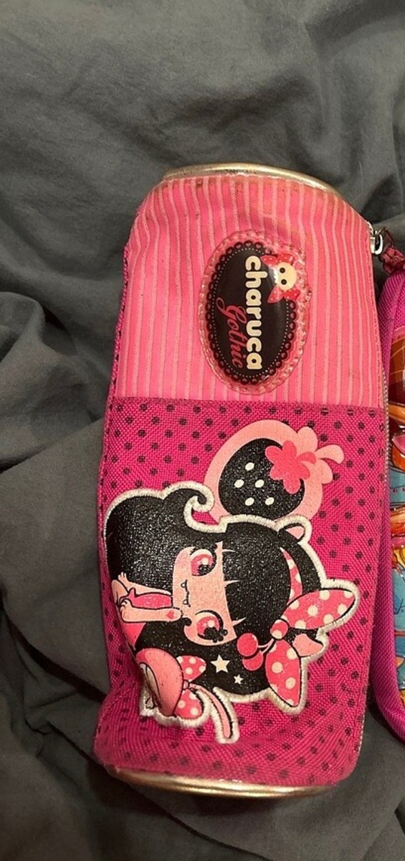 Renkli pembe çocuk kalem kutusuı, önünde 'charucca' markası ve çizgi karakter desenine sahiptir.