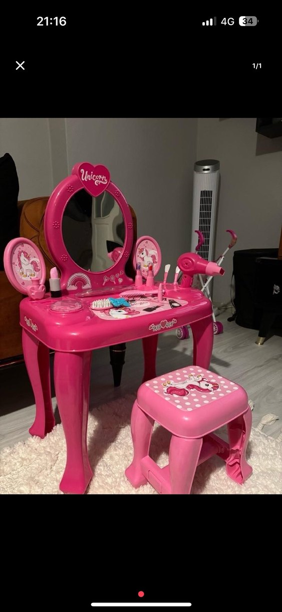 Aynasında ufak çatlak var. Yuvarlak aynalı, kalp şekilli çerçeveli, oyuncak makyaj aksesuarlarıyla renkli pembe çocuk makyaj masası ve uyumlu tabure. Hayal gücünü destekler.