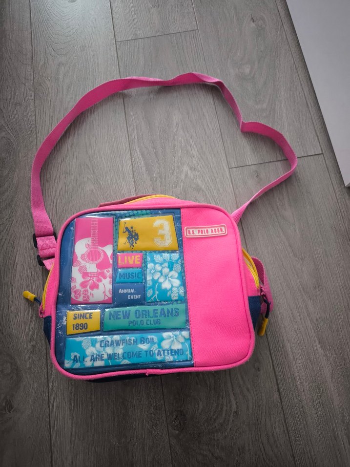 Omuz askılı, canlı baskılı renkli pembe çocuk okul çantası. US polo az kullanilmiş