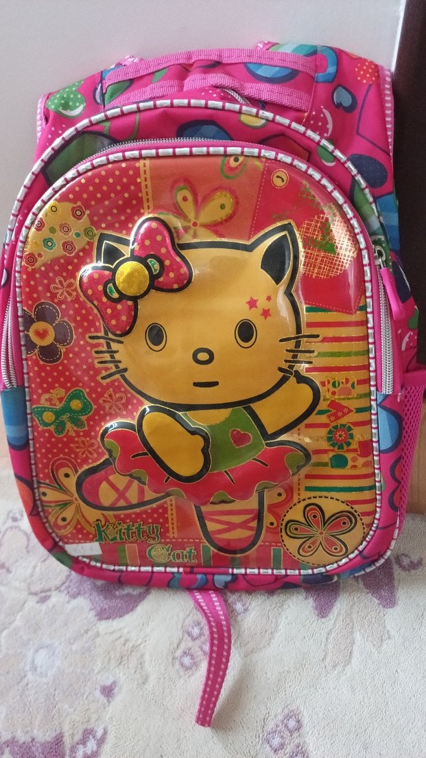 Ön cephesinde sevimli kedi figürü olan renkli pembe çocuk okul çantası, çok bölmeli ve canlı desenlere sahip.