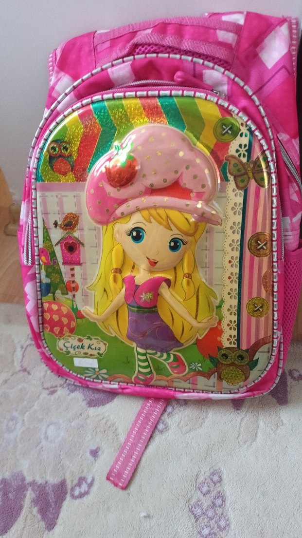 Renkli gökkuşağı çizgileri ve düğmelerle süslenmiş, önünde oyuncu bir çizgi film kız figürü bulunan pembe çocuk okul çantasıdır. Yumuşak ve sağlam yapıya sahiptir. sıfır üründür onu kabartmalıdir
