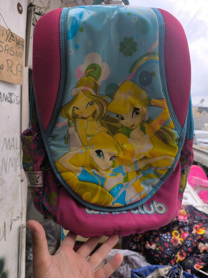 Önünde çizgi film perisi desenli renkli pembe çocuk okul çantası. Yanlarda file cepler ve sağlam tutacağı bulunur. ♀️ hiç kullanılmadı.