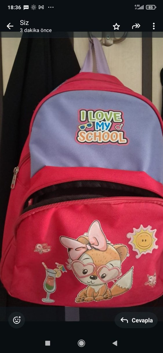 Renkli pembe çocuk okul çantasında neşeli baskılar ve 'I LOVE MY SCHOOL' yazısı bulunur. Çoklu fermuarlı bölmeleri vardır. yeni fazla olduğu için satılıyor