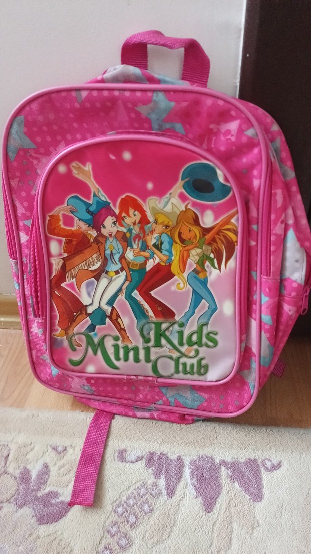Renkli pembe çocuk okul çantası, ön cepte animasyon karakterleri ve 'Kids Mini Club' yazısı ile dikkat çekiyor. Ayarlanabilir askıları var. sıfır üründür