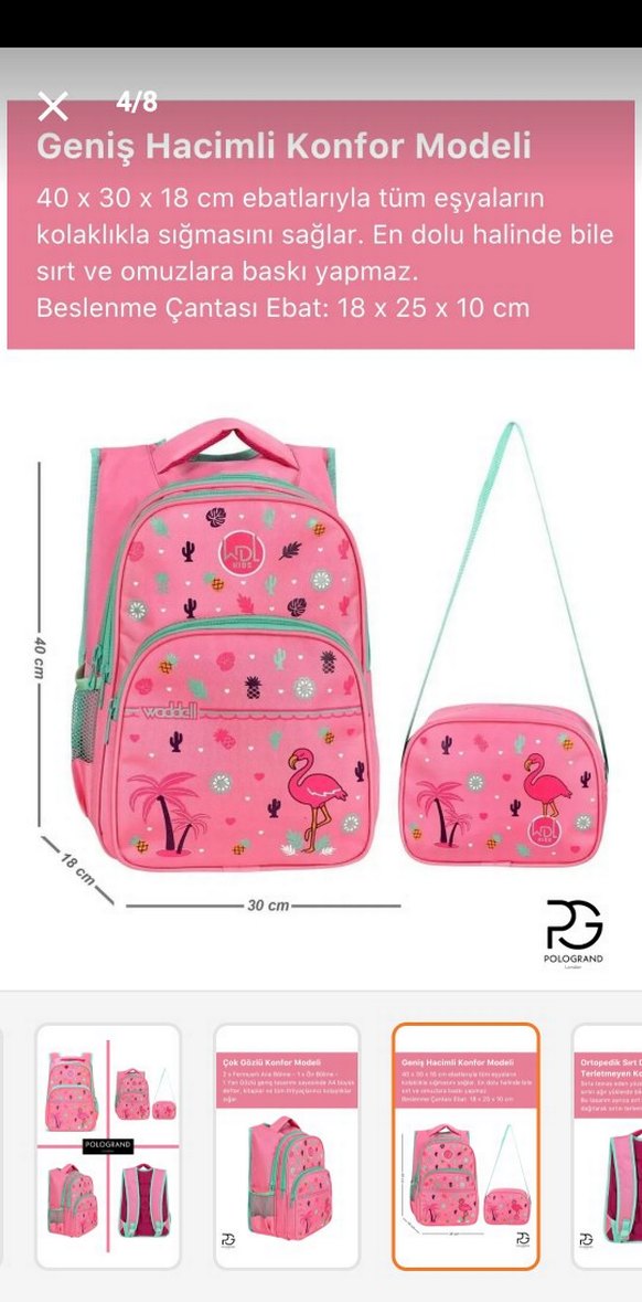 40x30x18 cm boyutlarında renkli pembe çocuk okul çantası, eşyaları rahatça taşır, sırt ve omuzlara baskı yapmaz. 18x25x10 cm beslenme çantası dahildir. Ortopedik sırt desteği sayesinde sırta baskı yapmaz rahat taşıma sağlar, sadece suluk yeri yırtık diğer kısımları sağlamdır. beslenme çantasında deforme mevcut fiyat makul tutulmuştur Güncel fiyatı 900 tldir