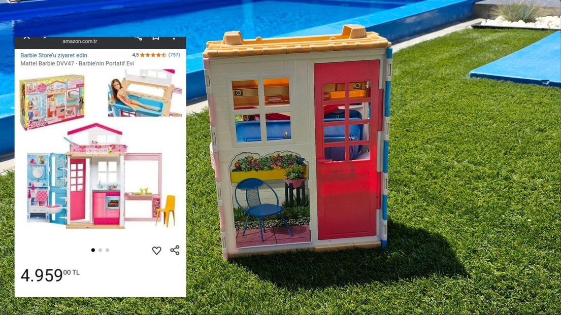 Pembe kapılı ve detaylı pencere süslemeleri olan renkli çocuk oyun evi, açık havada hayal gücünü destekler.
