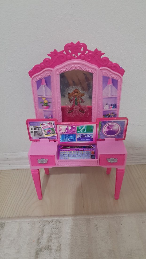 Renkli pembe çocuk oyun makyaj masası, süslü aynası ve iki küçük çekmecesi ile hayal gücünü artırır.