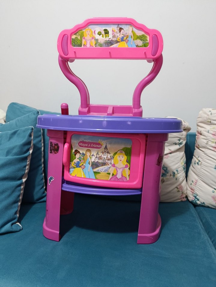 Renkli pembe çocuk oyun mutfak masası, küçük raf ve prenses temalı çıkartmalarla hayal gücünü destekler.