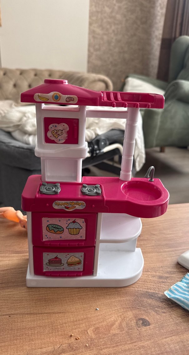 Renkli pembe çocuk oyun mutfağı, ocak, lavabo ve saklama bölmeleri içerir, hayal gücünü destekler.