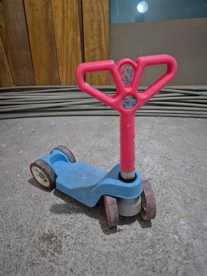 Pembe tutma kolu ve mavi tabanı olan, dört tekerlekli renkli çocuk scooter'ıdır. Çocuklar için eğlenceli ve güvenli sürüş sağlar.