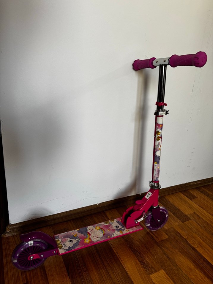 Renkli pembe çerçevesi, mor tekerlekleri ve konforlu pembe tutacakları olan çocuk scooterı. Dayanıklı tasarıma sahiptir.
