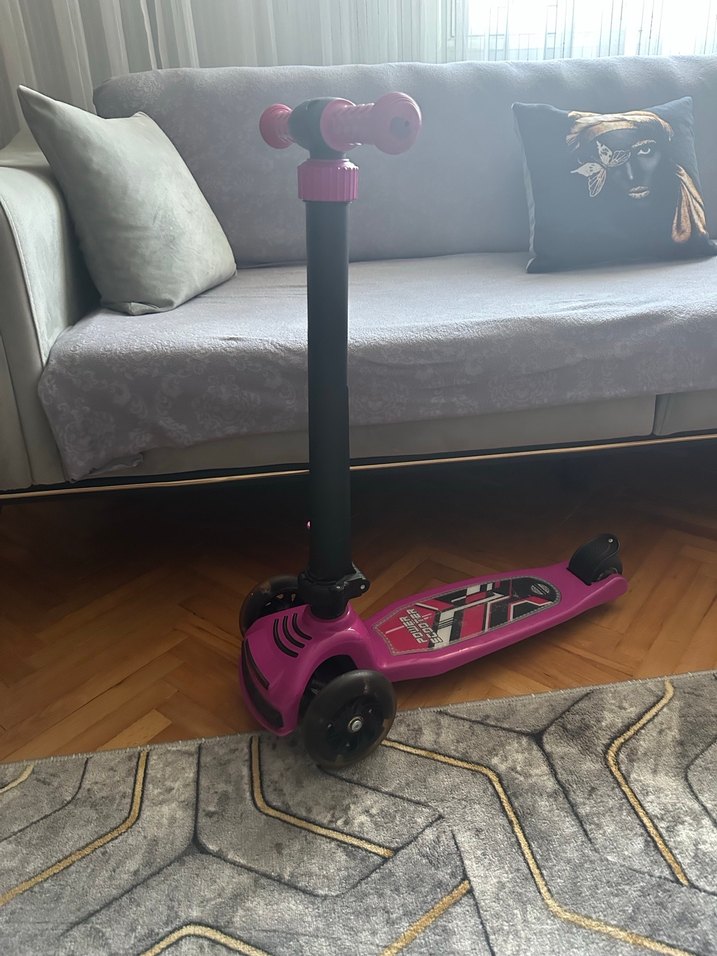 Üç tekerlekli, ayarlanabilir direksiyonlu renkli pembe çocuk scooterı, kolay denge ve eğlenceli sürüş için tasarlanmıştır. sayılı kullanıldı tekerleklerden anlaşılıyor aşınma vs söz konusu değil