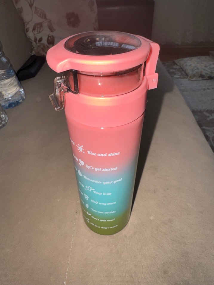 Renkli pembe termos şişe, kilitli kapak ve üzerindeki motive edici yazılarla çocuklar için içecekleri sıcak tutar.