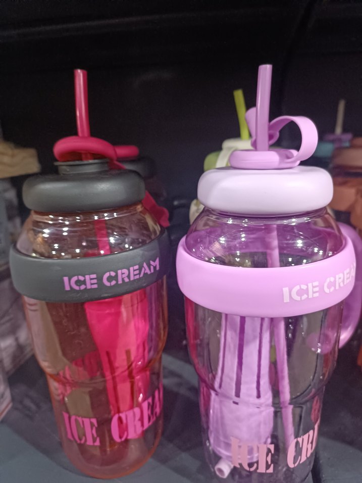 Renkli pembe çocuk termos şişeleri, pipetli kapaklı ve "ICE CREAM" yazılı, içecekleri güvenle taşımak için uygundur.