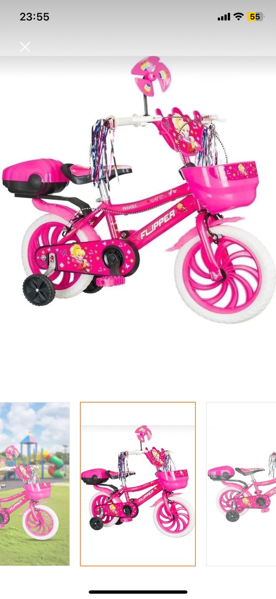 Renkli pembe üç tekerlekli bisiklet, sepet, yardımcı tekerlekler ve gidonlarda dekoratif püsküller içerir. Aynısı kaldırdığım için resim koyamadım kızım kullanmıyor uyguna vermek isterim