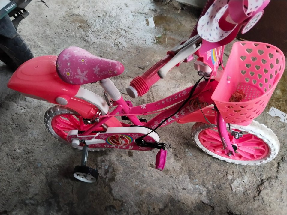 Renkli pembe çocuk üç tekerlekli bisiklet, sağlam pedallar ve rahat bir seleye sahiptir. 16 jant durumu yeni gibi