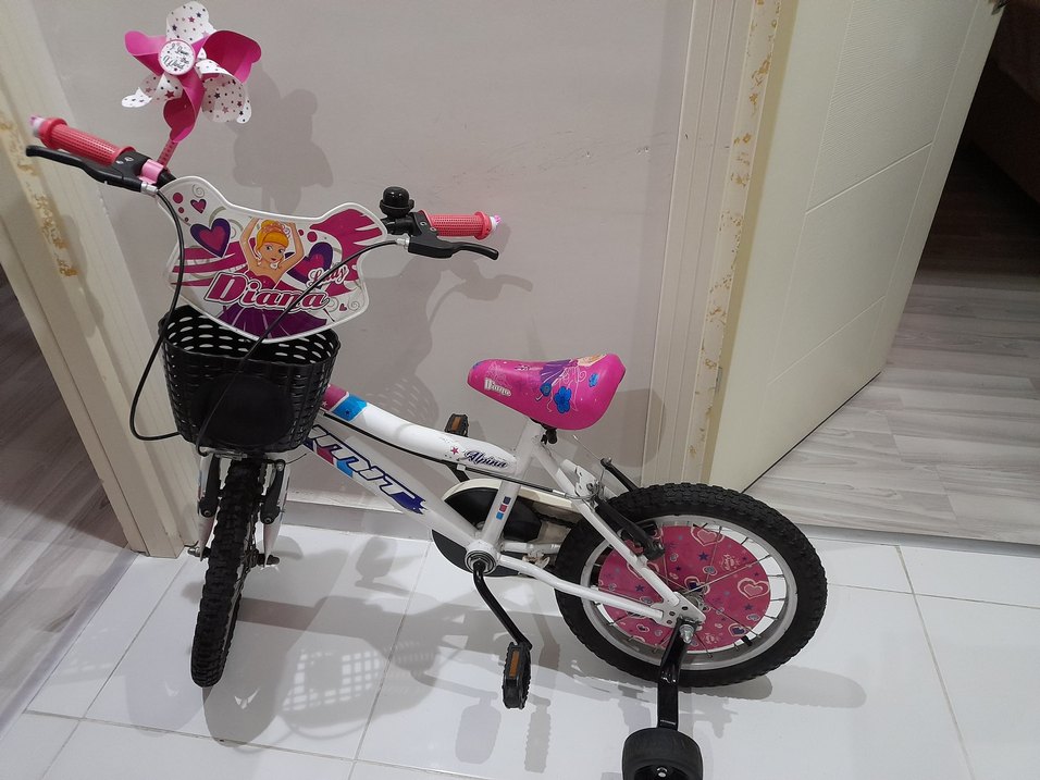 Renkli pembe üç tekerlekli bisiklet, rahat oturma yeri ve denge için destek tekerleklerine sahiptir. Önde sepet ve kolay kontrol için gidon tutamakları bulunur. Yeni hiç kullanılmadı