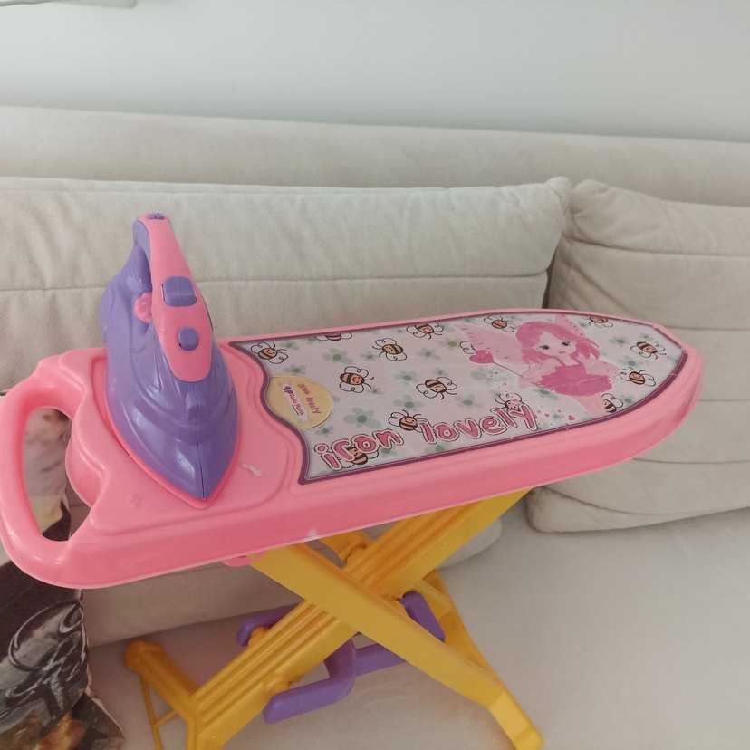 Çizgi film desenli renkli pembe çocuk ütü masası, ayarlanabilir sarı ayaklarla. Oyun zamanları için uygundur.