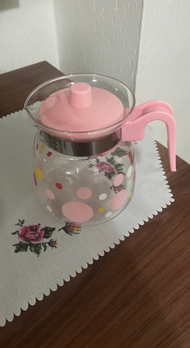Bu cam demlik, pembe kapak ve sapıyla renkli puantiye desenlerine sahiptir. Çay servisinde şık bir seçenek sunar.