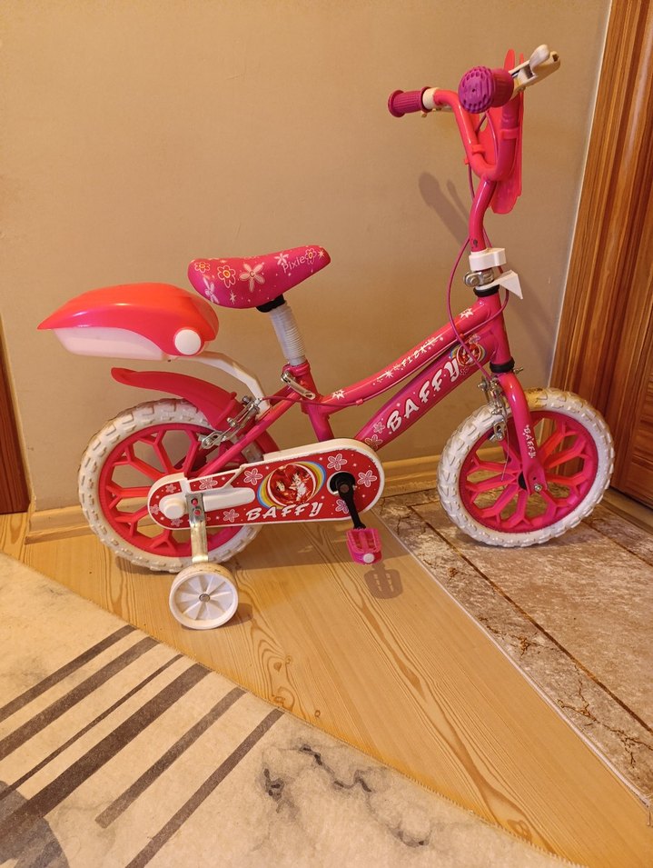 Renkli pembe Diger çocuk bisikleti, destek tekerlekleri, yumuşak oturma yeri ve arka saklama bölmesi ile kullanışlıdır.