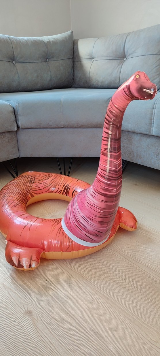 Uzun boyunlu, renkli pembe dinozor şişme havuz oyuncağı, çocuklar için plaj ve havuz keyfi sağlar.