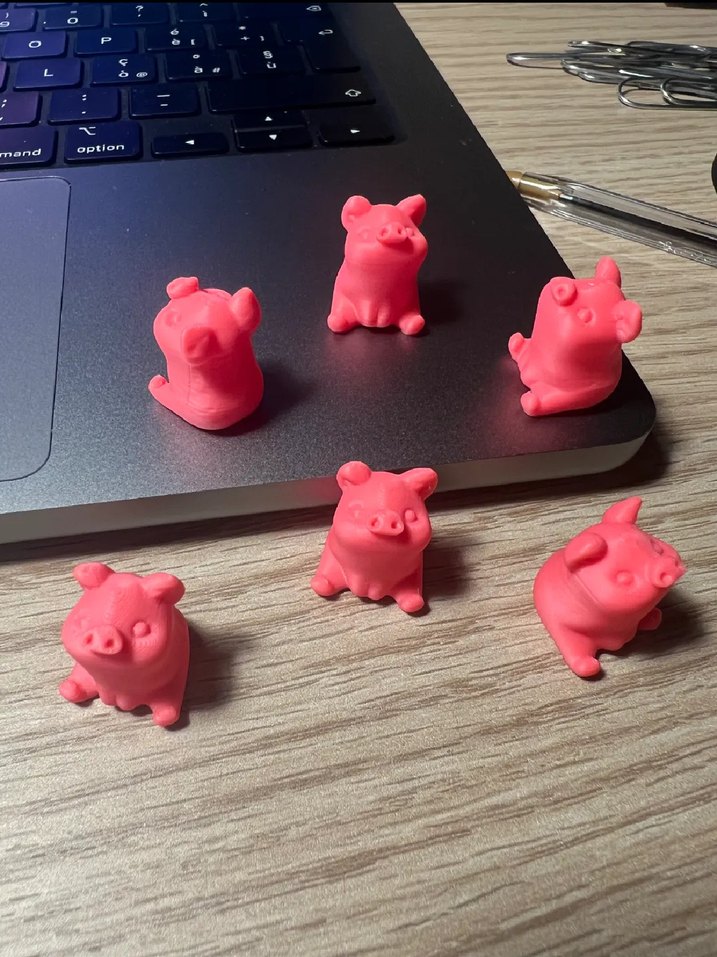 Yumuşak, esnek malzemeden yapılmış renkli pembe domuz figürlü küçük oyuncaklar. Dekorasyon veya koleksiyon için uygun.