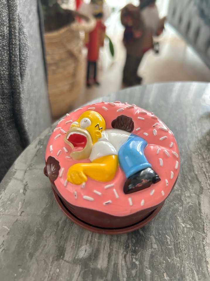 Renkli detaylara sahip, beyaz şekerlemeli pembe bir donut üzerinde yatan Homer Simpson figürü. Eğlenceli bir anı yansıtıyor.