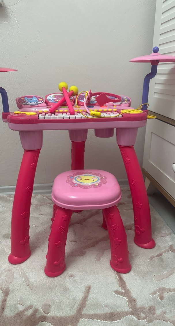 Çocuklar için renkli pembe eğitici müzik seti; klavye, davul, zil ve uyumlu tabure içerir.