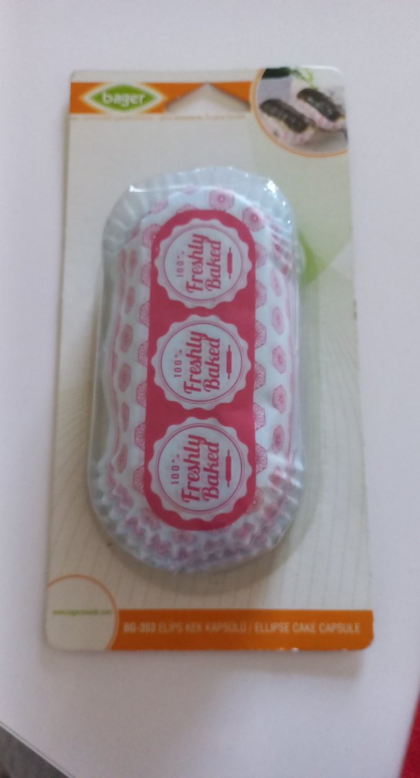 Renkli pembe elips şekilli, "100% Freshly Baked" yazılı kek kapsülleri.