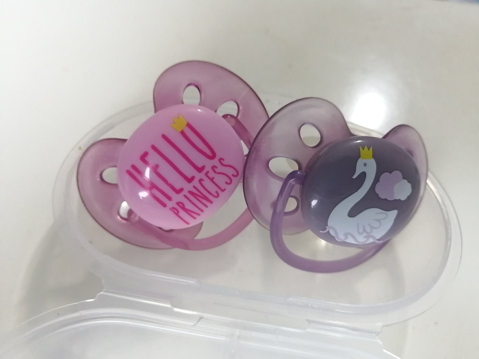 Pembe tonlarında, 'Hello Princess' ve kuğu desenli renkli emzik seti. Görüldüğü gibi. Bebeğim tutmadı.