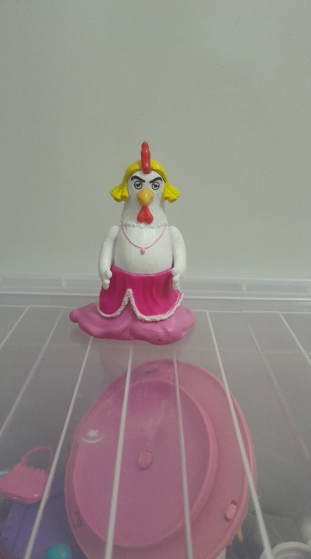 Renkli ve detaylı yüz ifadelerine sahip, pembe etek giymiş tavuk figürü pembe bir taban üzerinde duruyor.
