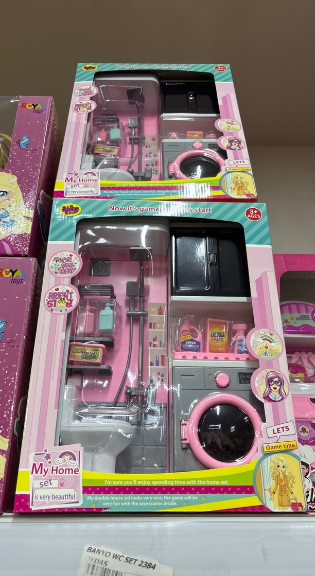 Renkli pembe oyuncak ev seti, çamaşır makinesi, lavabo ve aksesuarlar içerir. Üzerinde 'My Home LETS set' yazısı bulunur.