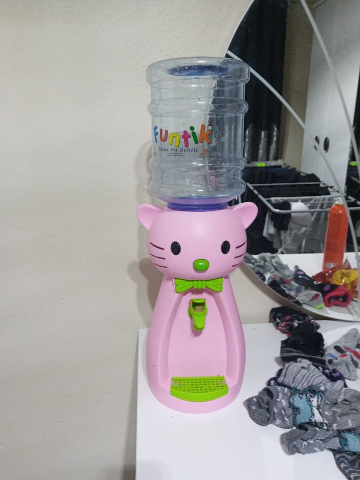 Renkli pembe Funtik su sebili, kedi şeklinde sevimli tasarıma sahip. Şeffaf su haznesi ve kolay kullanım musluğu bulunur. resim de görünüyor çatlak yeri ama hiç Bir yerde su akitmiyor çeşmede çalışıyor