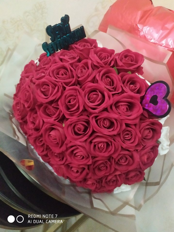 Renkli pembe allık güllerle hazırlanmış, dekoratif detaylara sahip şık bir buket. yapay gül
