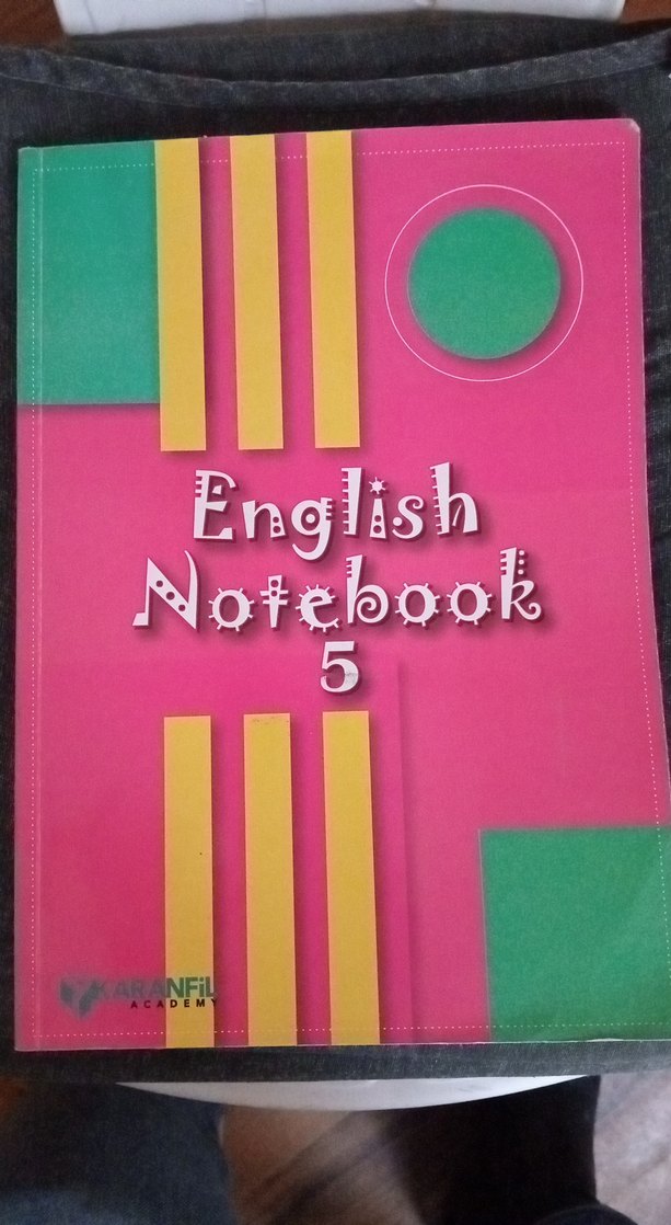 Renkli pembe kapaklı bu defterin üzerinde İngilizce yazı ve 5 numarası bulunuyor. Not almak ve ders çalışmak için uygundur.