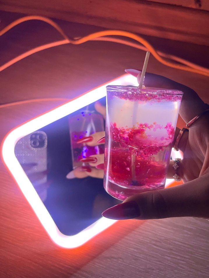Canlı pembe tonlarda, renkli ve dekoratif jel mum simli sallanınca simler sallanır